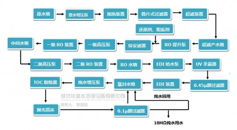 其流程: 原水箱增壓泵多介質(zhì)過濾器活性炭過濾器保安過濾器高壓泵一級反滲透純水箱